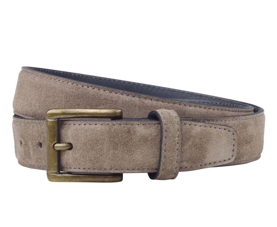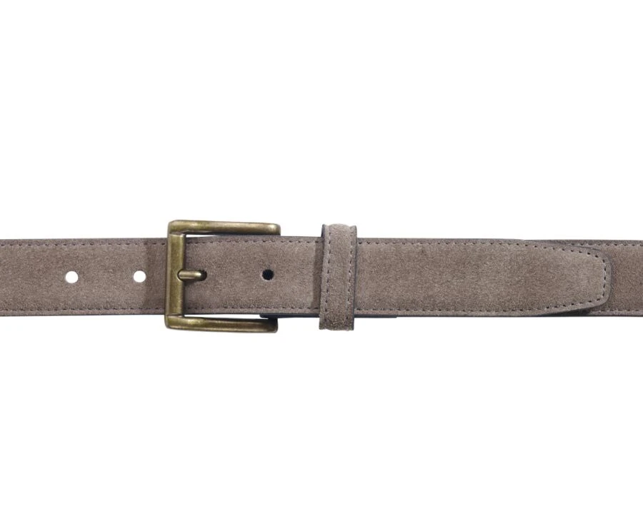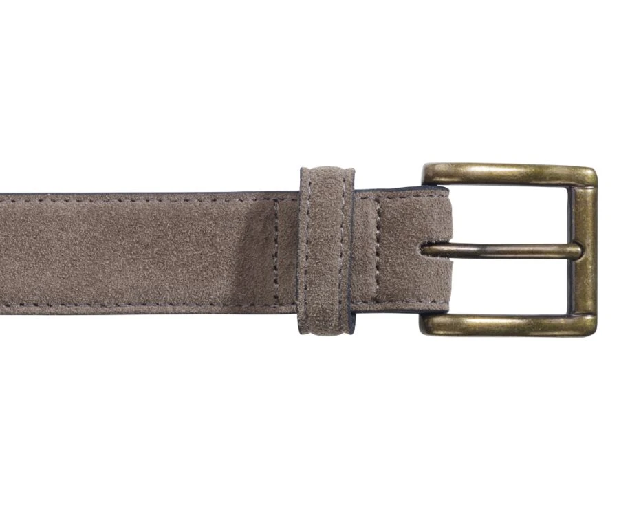 Ceinture en velours, doublure cuir, fermée par une boucle carrée en laiton massif, avec un passant en cuir.
