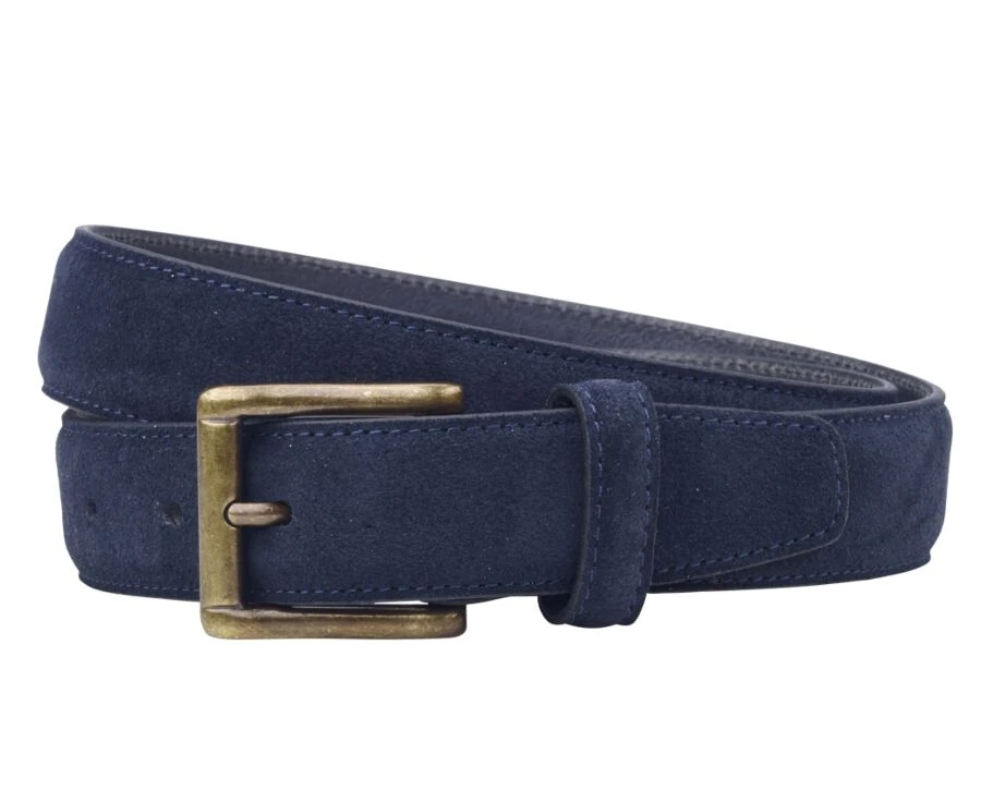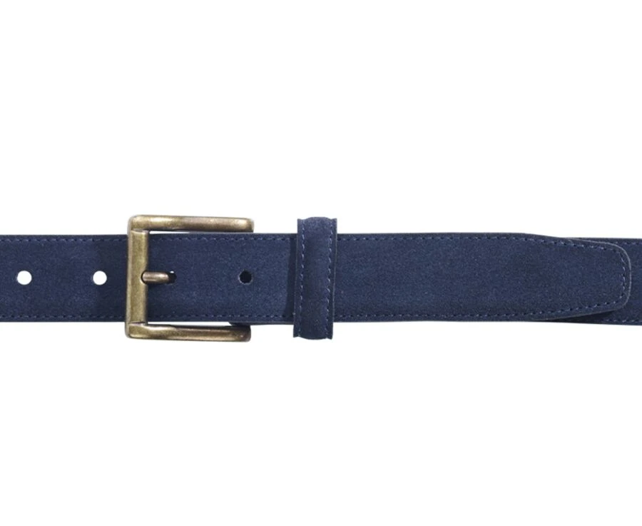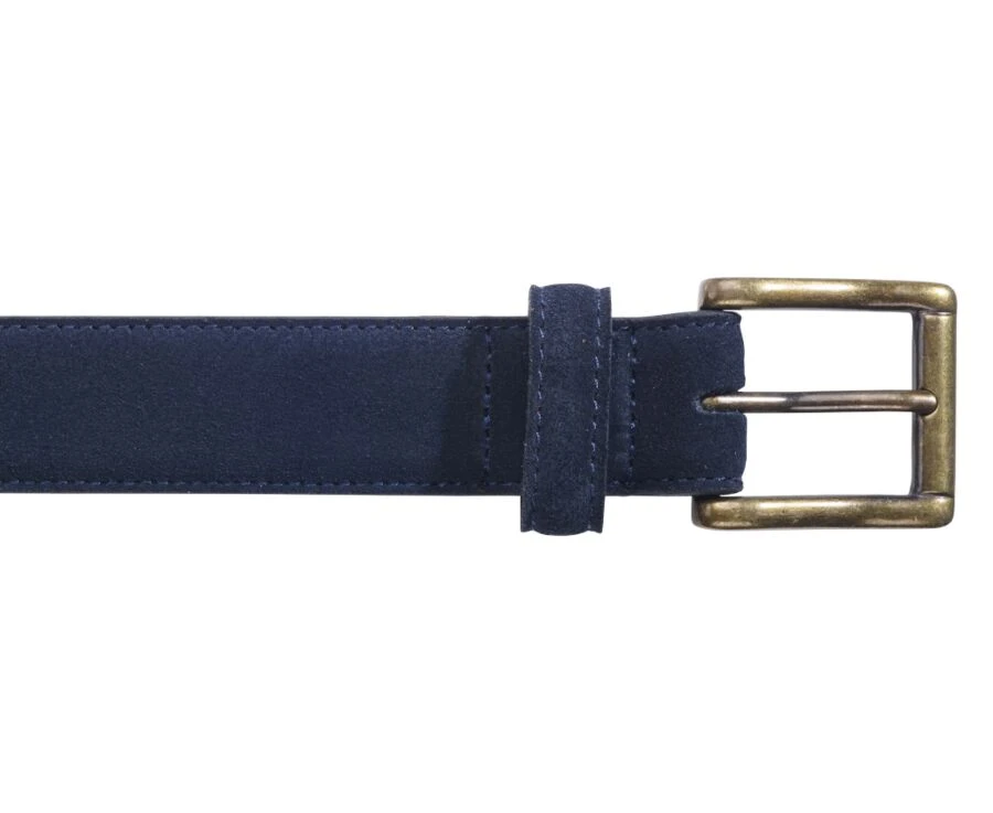 Ceinture en velours, doublure cuir, fermée par une boucle carrée en laiton massif, avec un passant en cuir.