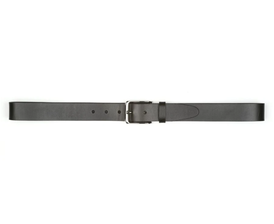 Ceinturon en cuir de vachette tannage végétal, fermé par une boucle carrée en laiton massif nickelé, avec un passant en cuir.