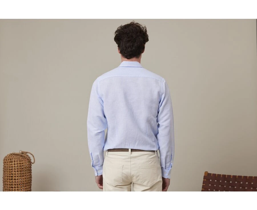 Une chemise homme lin et coton avec un col français, contemporaine, parfaite pour une tenue décontractée avec un pantalon chino ou un bermuda.