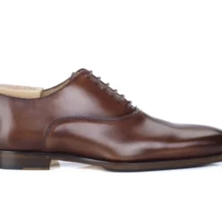 Réalisée en cousu Blake et veau box patiné, sur semelle en cuir avec patin en gomme intégré et avec trépointe en cuir. Œillets invisibles et lacets ronds en coton cirés ton sur ton.