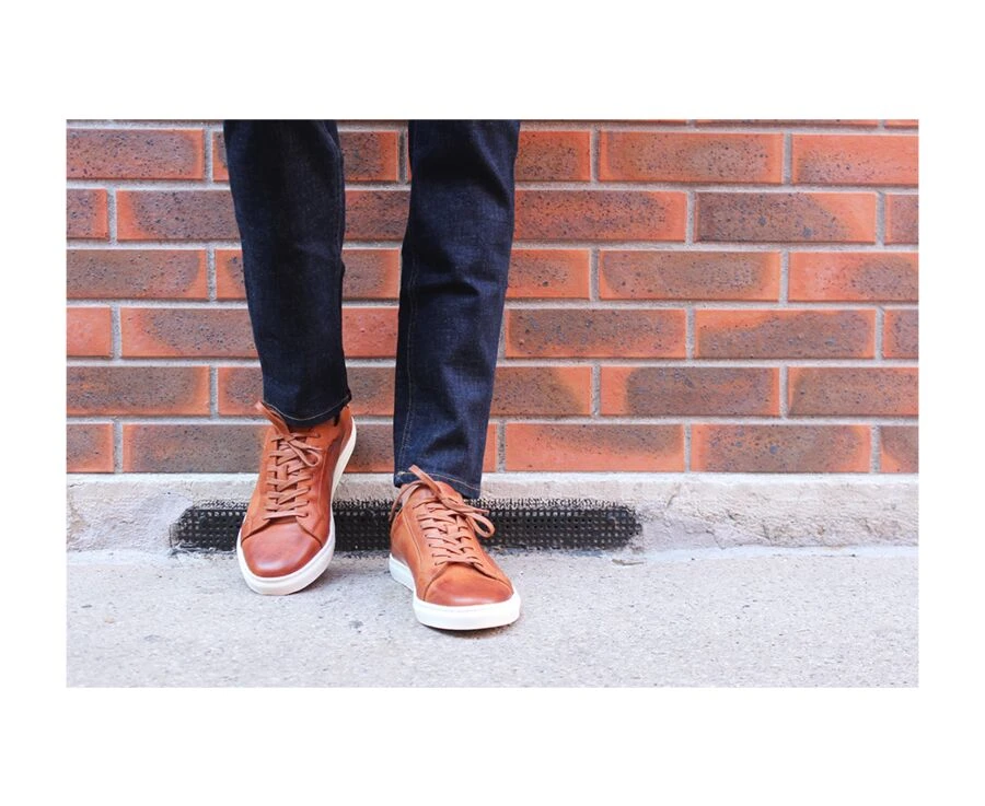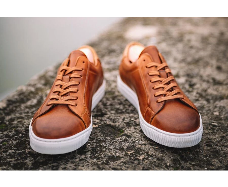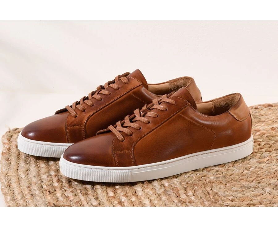 Ce sneaker est réalisé en cousu latéral et cuir de vachette patiné à la main, sur une semelle épaisse et confortable en caoutchouc. Renfort arrière en cuir. oeillets invisibles et lacets plats en coton cirés ton sur ton et première amovible en cuir de vachette.